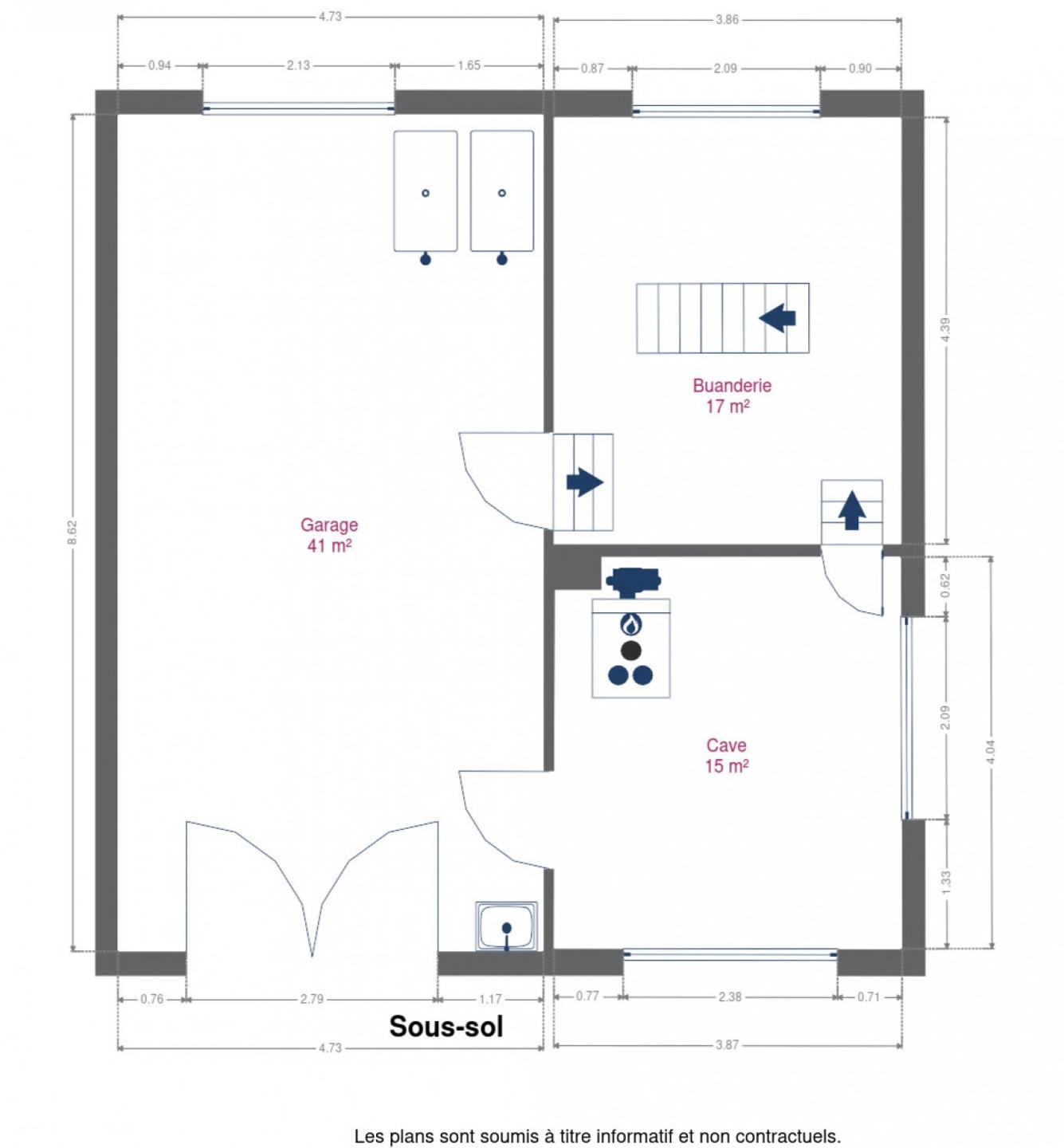 – au sous-sol : un garage de 41m², une buanderie ainsi qu’une cave
