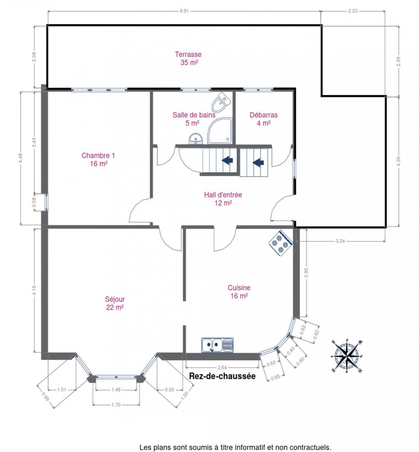 – un rez-de-chaussée : un hall d’entrée, une cuisine, une séjour, une chambre, une salle de bains, un débarras et une terrasse