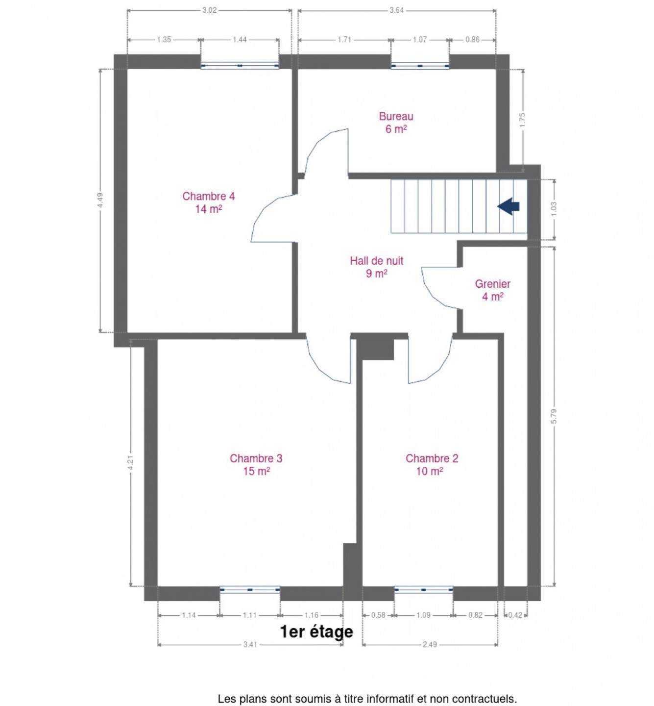 – au 1er étage : 3 chambres, un hall de nuit, un grenier et un bureau