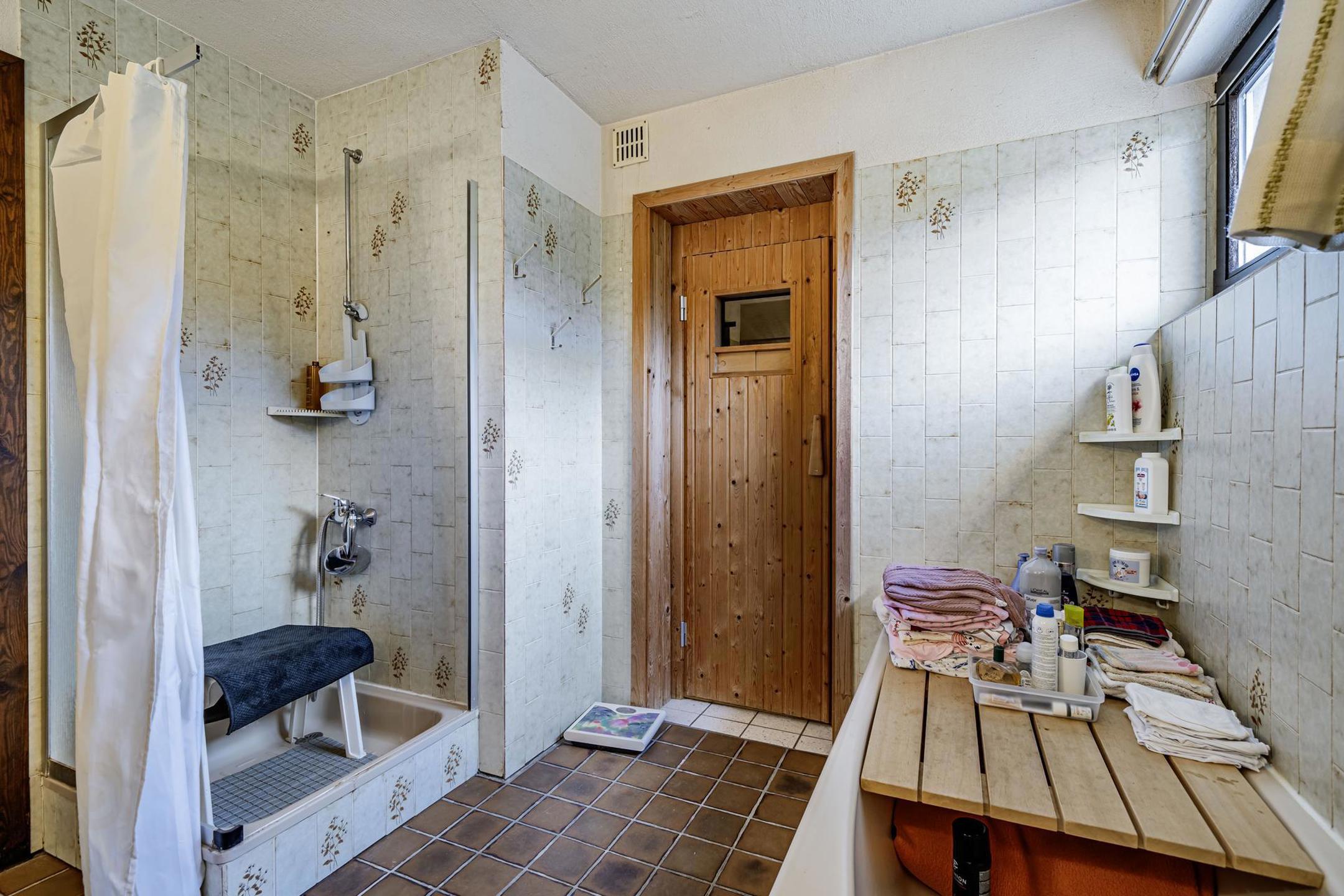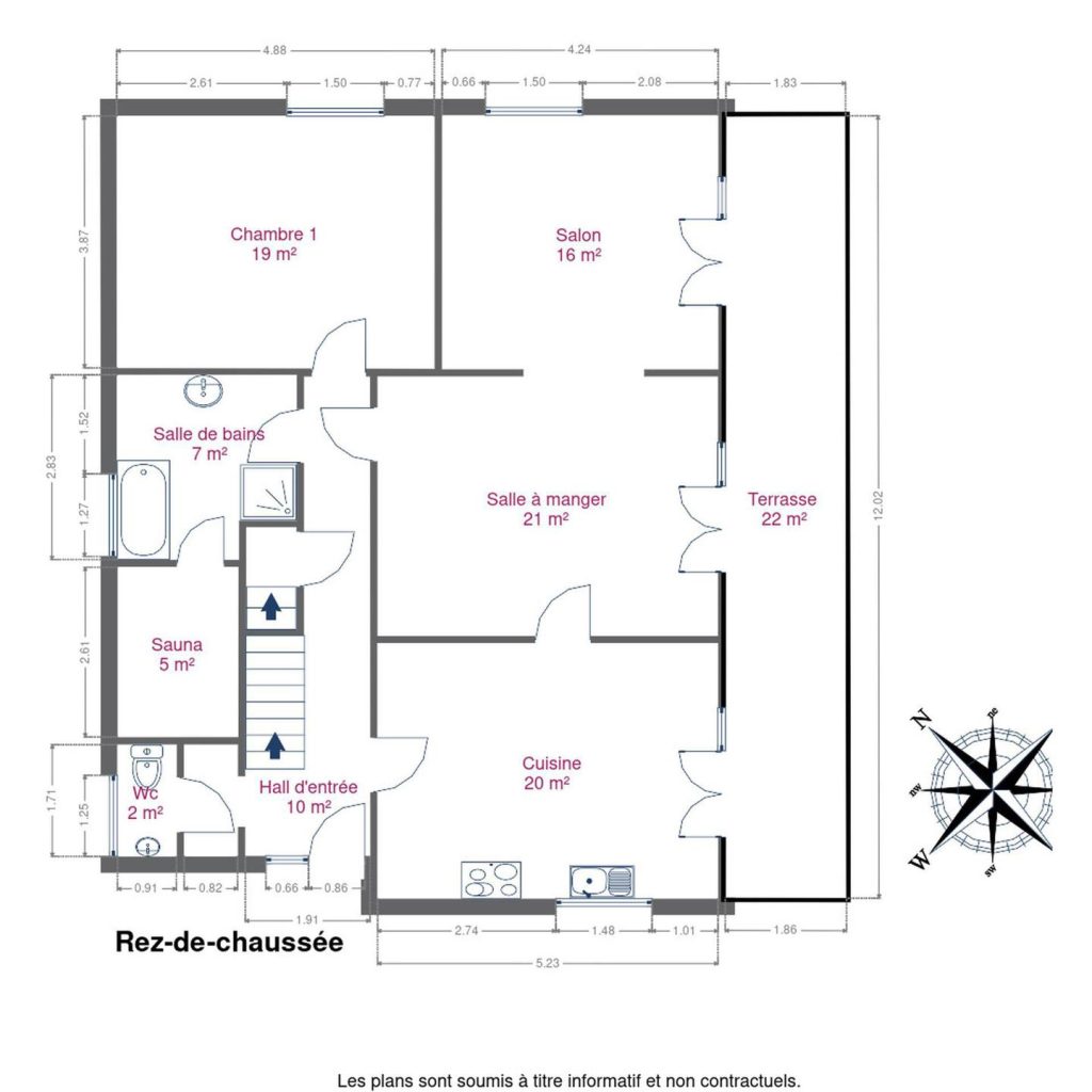 – au rez-de-chaussée : un séjour de 37m², une cuisine, une chambre, une salle de bain, un sauna, une terrasse de 22m²