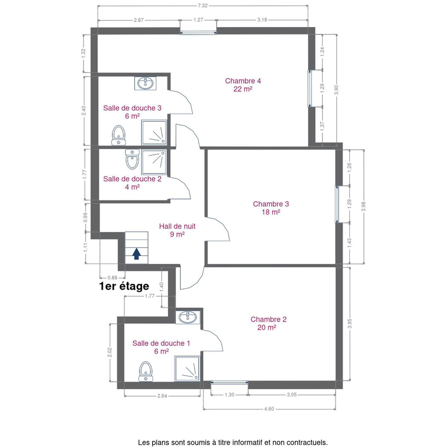 – au 1er étage : un hall de nuit, 3 chambres, 3 salles de douche
