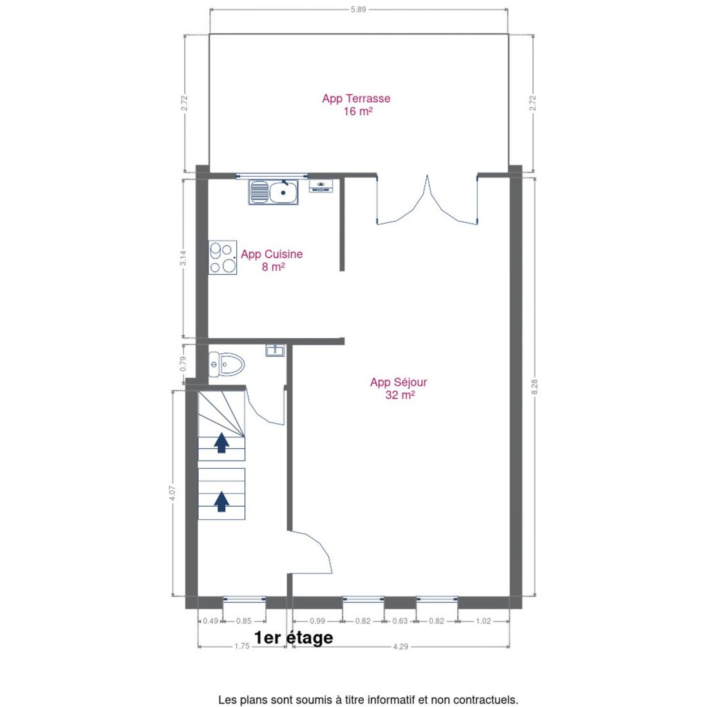 – au 1er étage : un séjour de 32m², une cuisine, une terrasse de 16m²