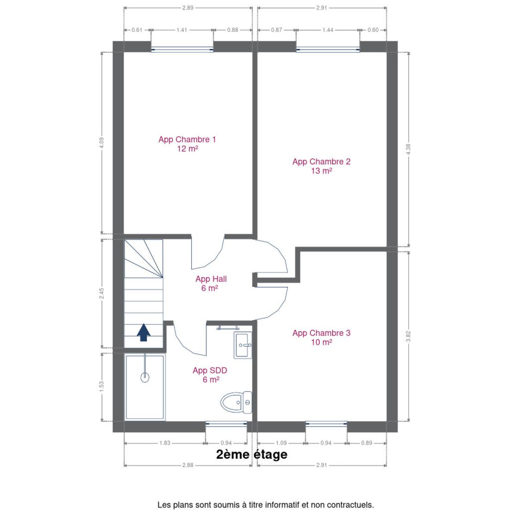 – au 2ème étage : un hall, 3 chambres et une salle de douche