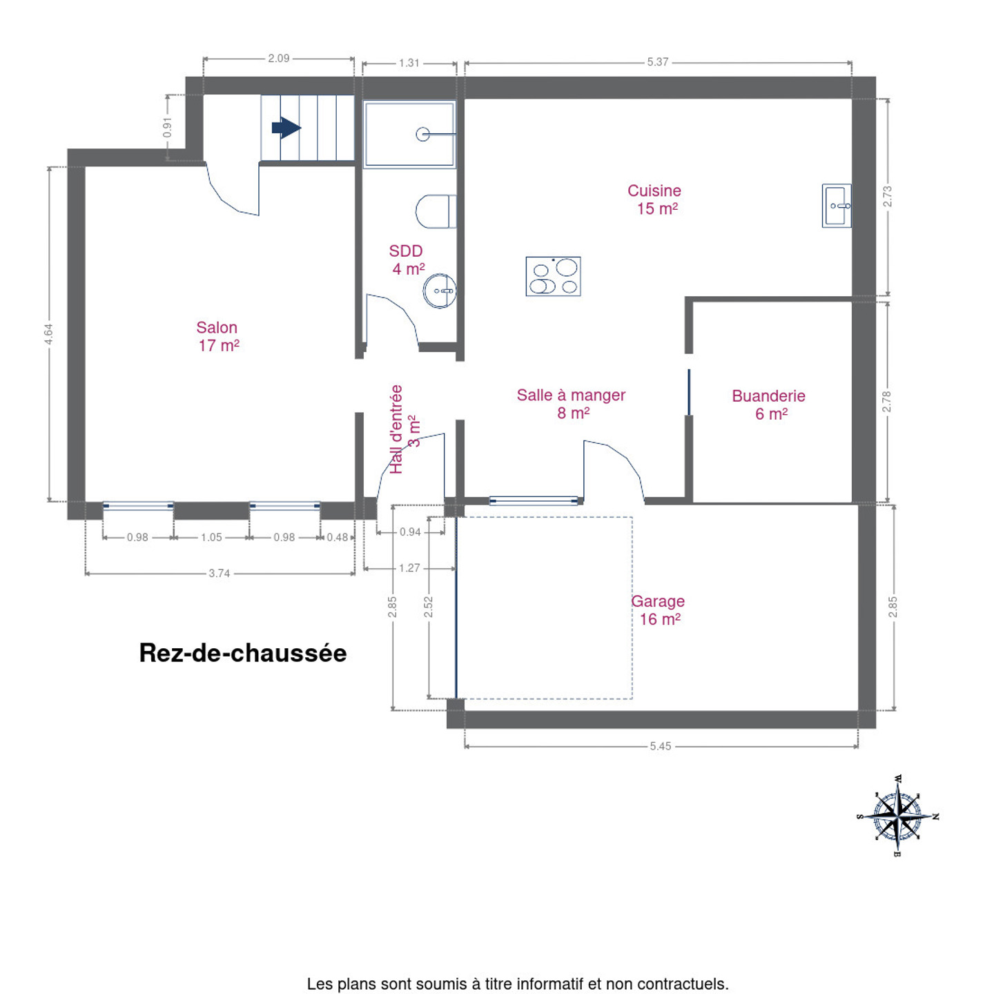 Rez-de-chaussée : garage, cuisine, séjour lumineux, buanderie, WC et salle de bain.