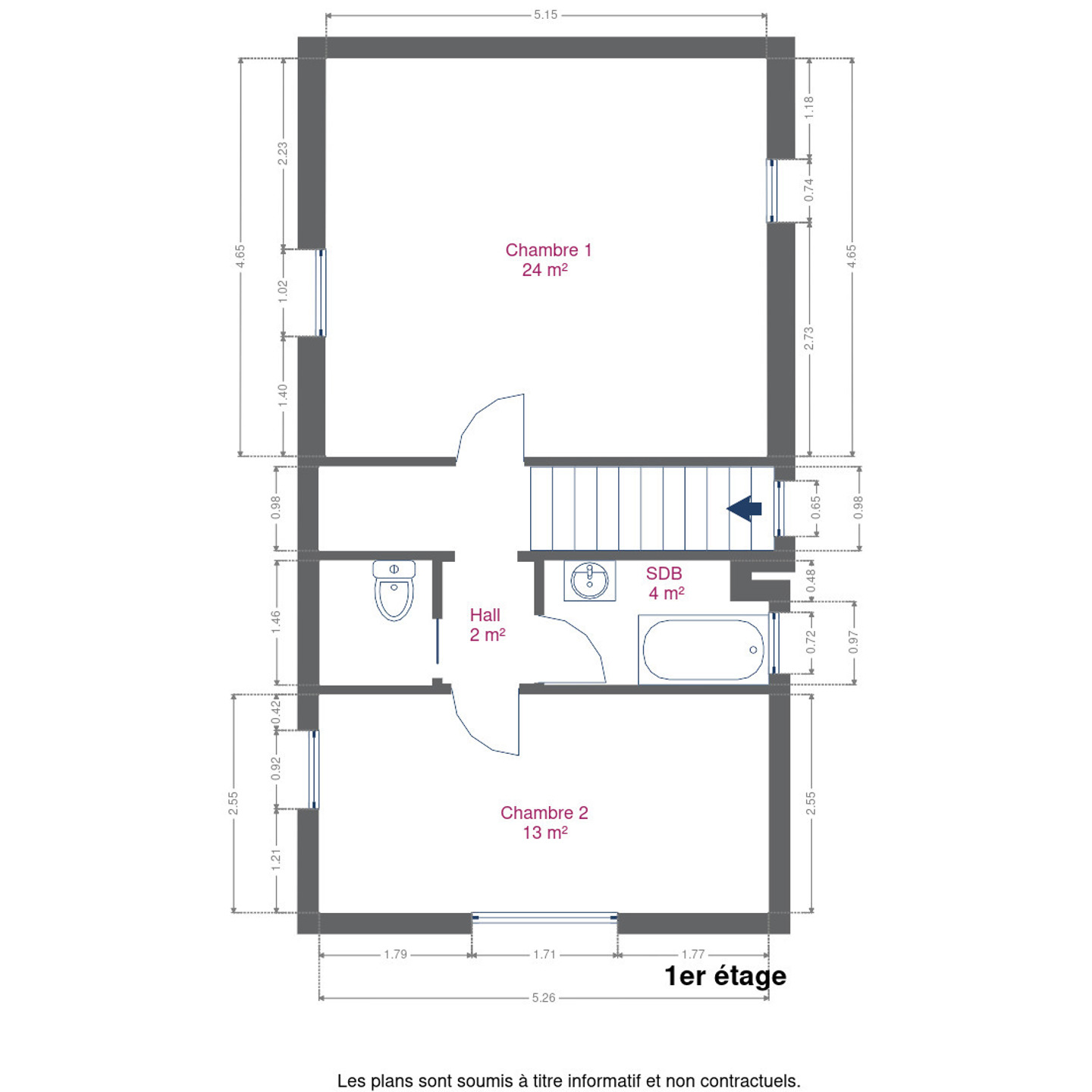 À l’étage, vous trouverez deux chambres à coucher, une salle de bain et un WC.
