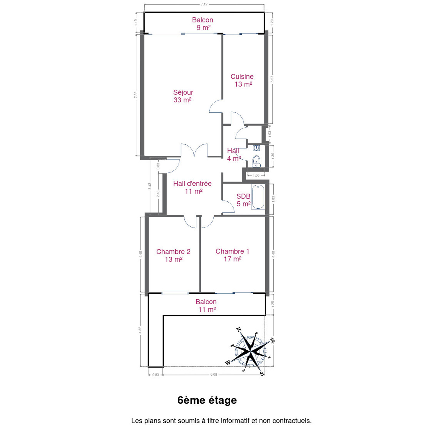 L’appartement dispose également de deux balcons : un à l’avant orienté nord et un à l’arrière orienté sud.